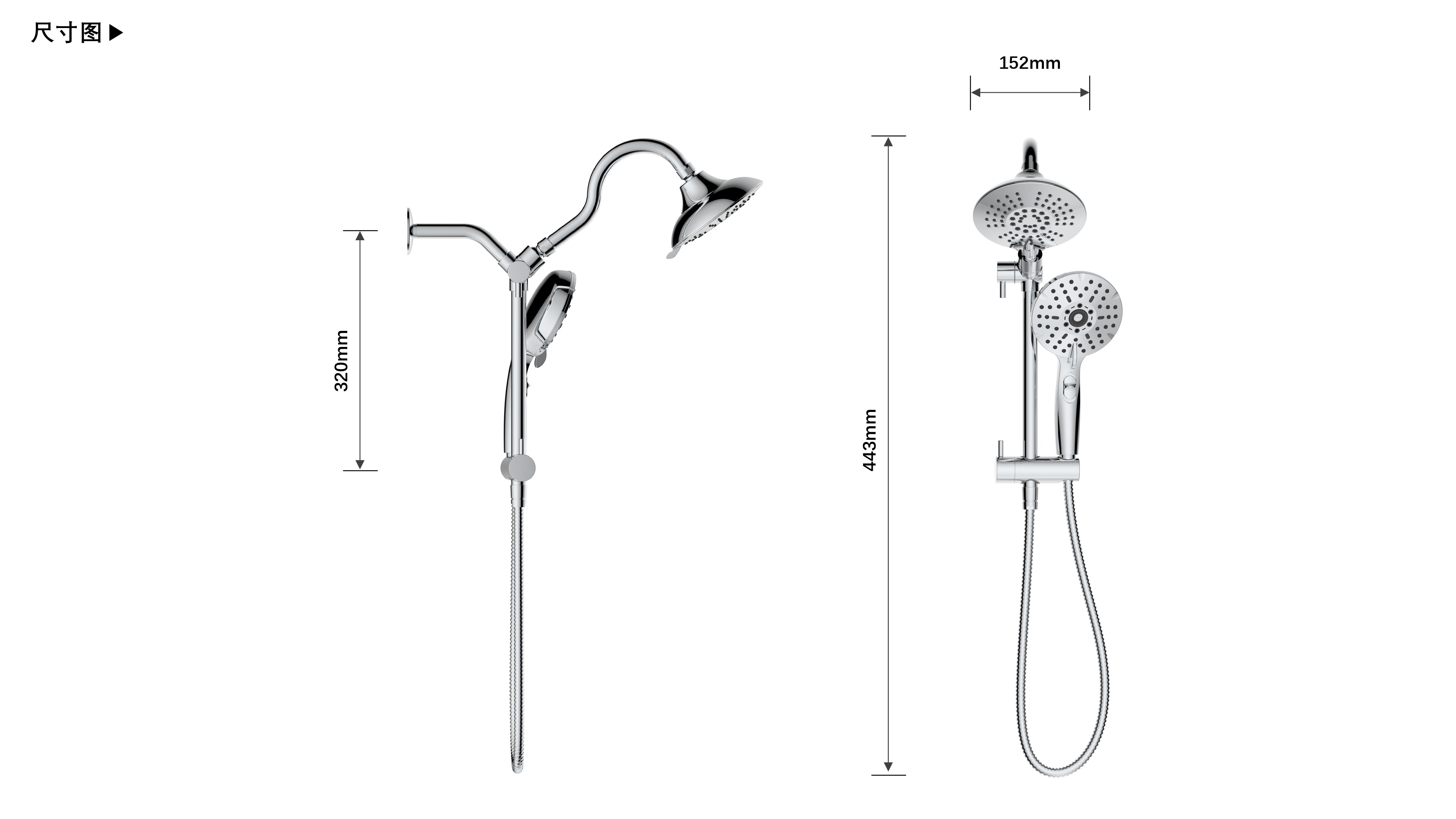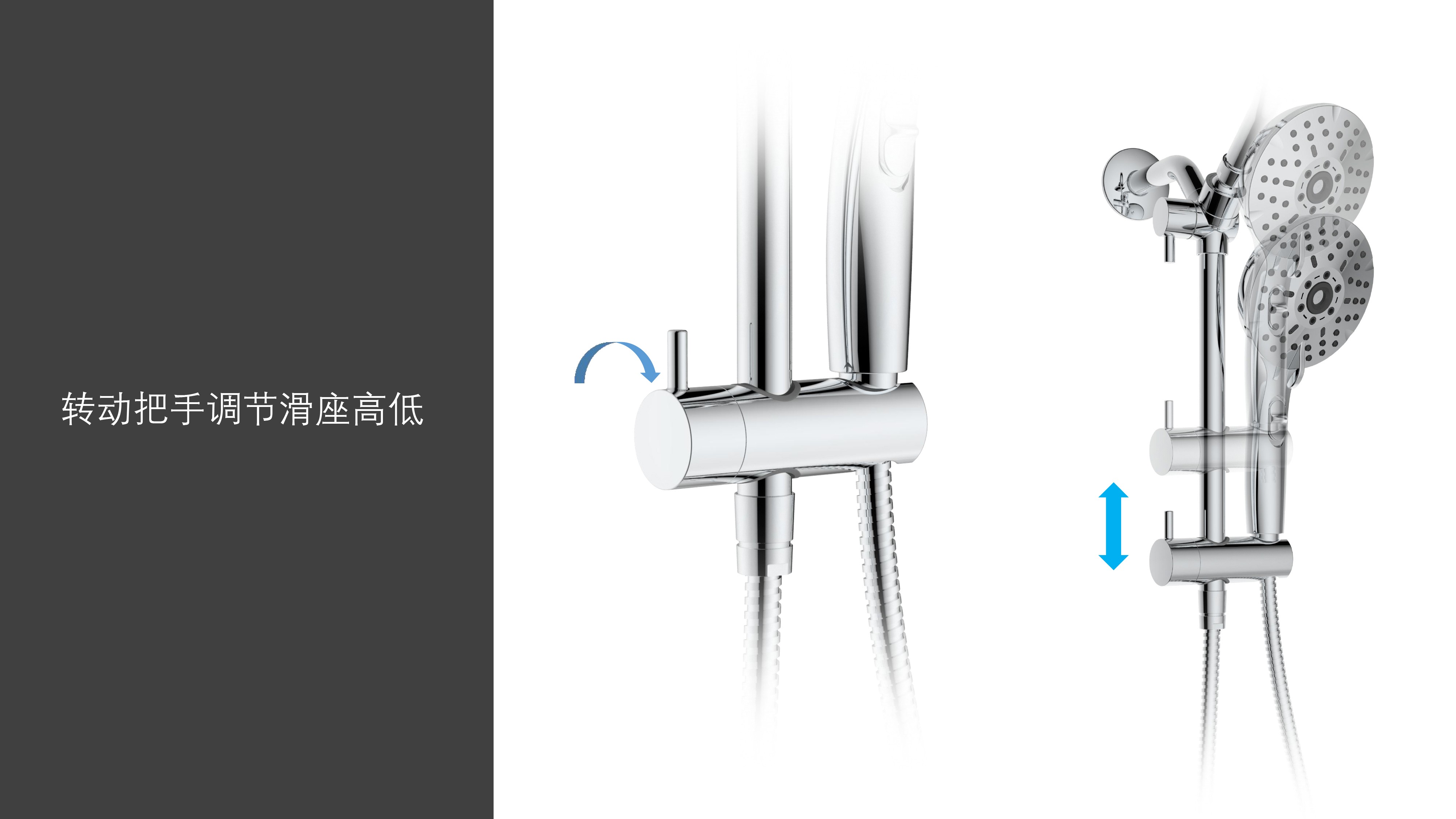 上出水彎管套裝;頂噴內置球頭,可實現多角度旋轉調整;把手切換頂噴出水、花灑出水;轉動把手調節(jié)滑座高低;5功能出水花灑